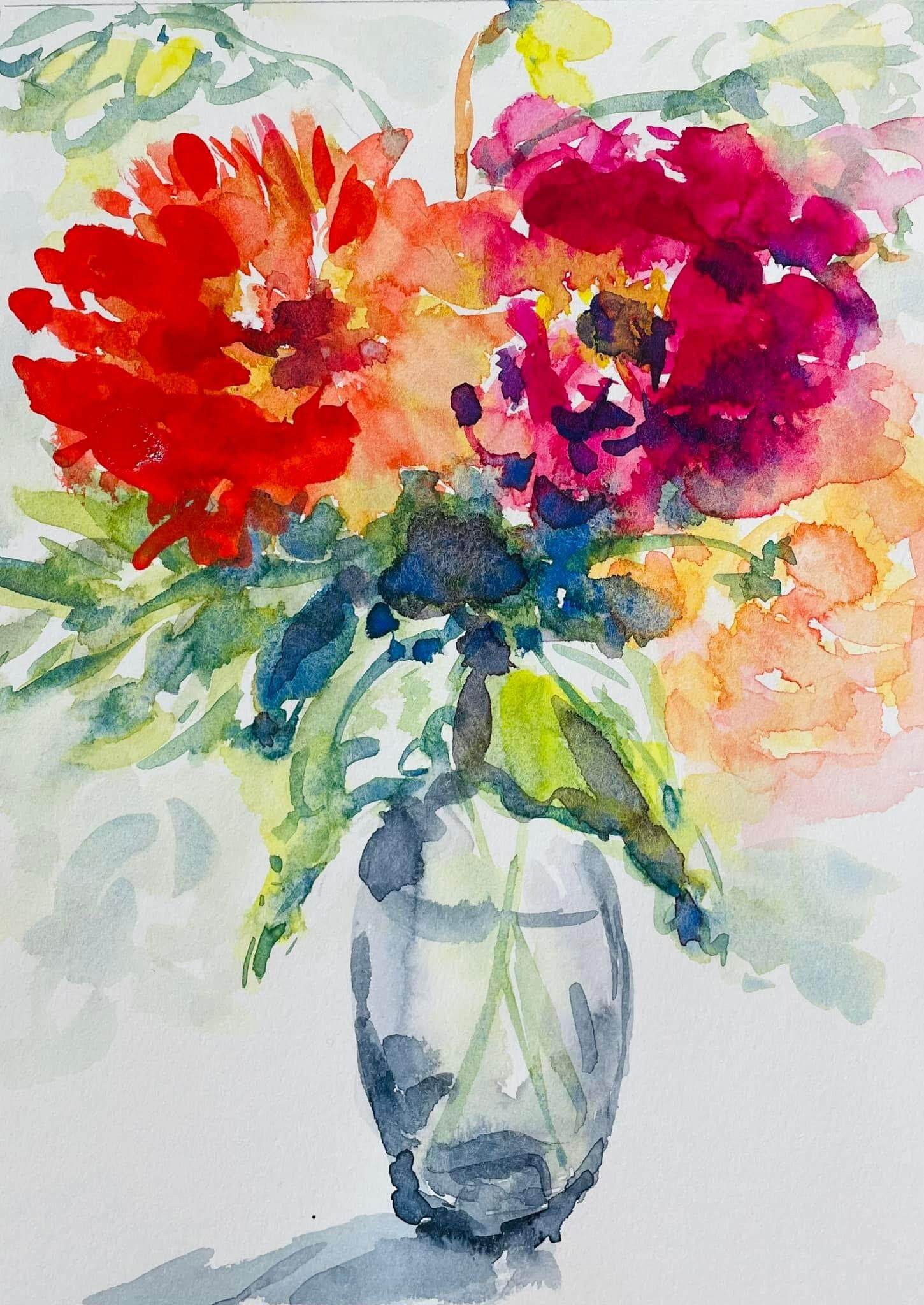 The day unfolds in three parts. We’ll begin by learning the essentials — brush handling, layering, wet-on-wet and wet-on-dry techniques — and gaining an understanding of how watercolour behaves on paper. From there, we’ll move into painting simple florals, breaking them down into shape and structure, and exploring more expressive, intuitive mark-making.